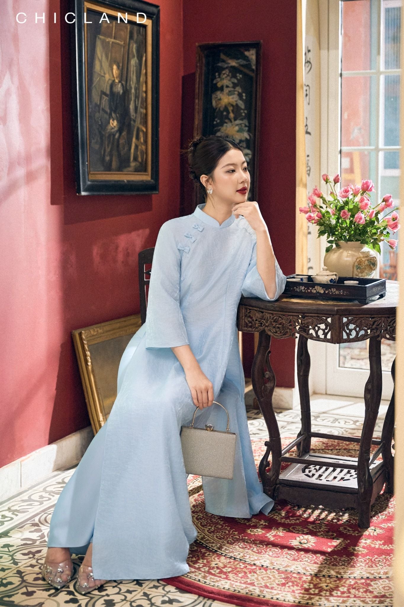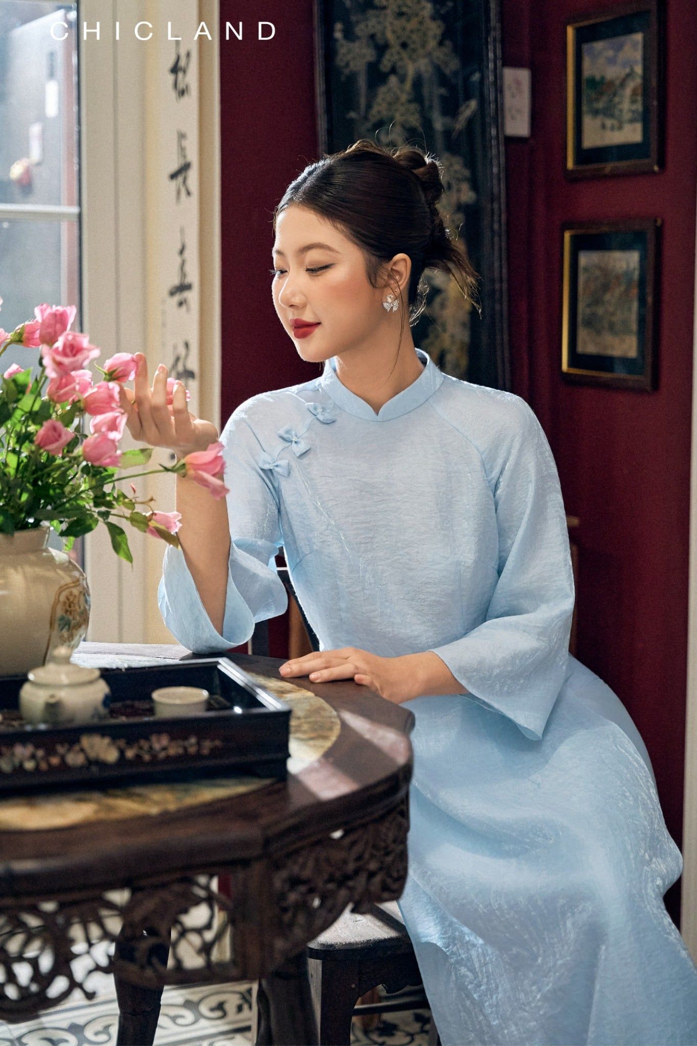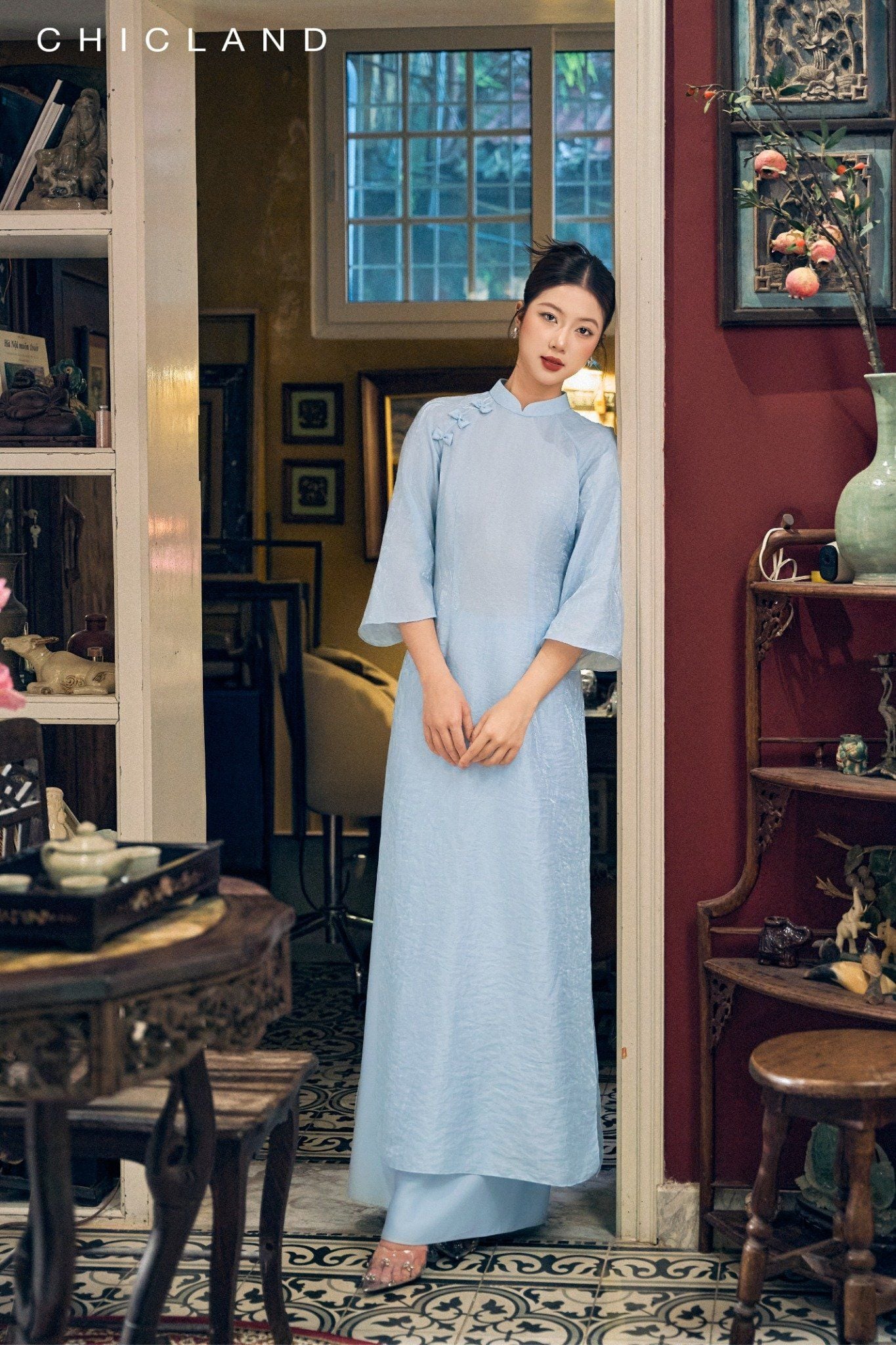 Chất liệu Lụa Chic-Land: Dòng sản phẩm: Áo Dài Chất liệu: Sử Dụng Sợi Tơ tự Nhiên, Bề Mặt vải Mịn Màng, Bóng Tự Nhiên, Nhẹ Nhàng, Thoáng Mát. Màu Sắc Áo : Xanh Màu sắc Quần : Xanh