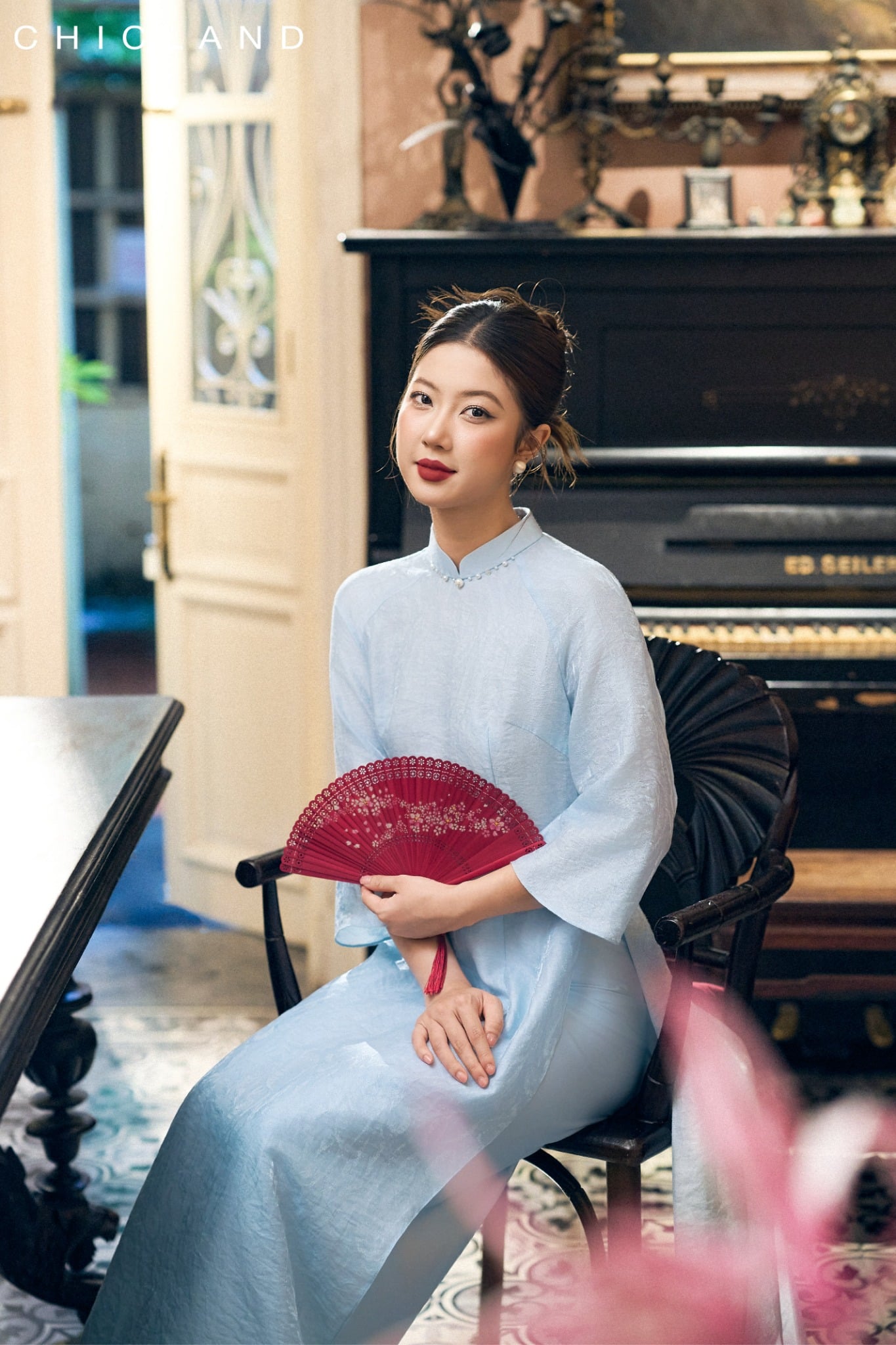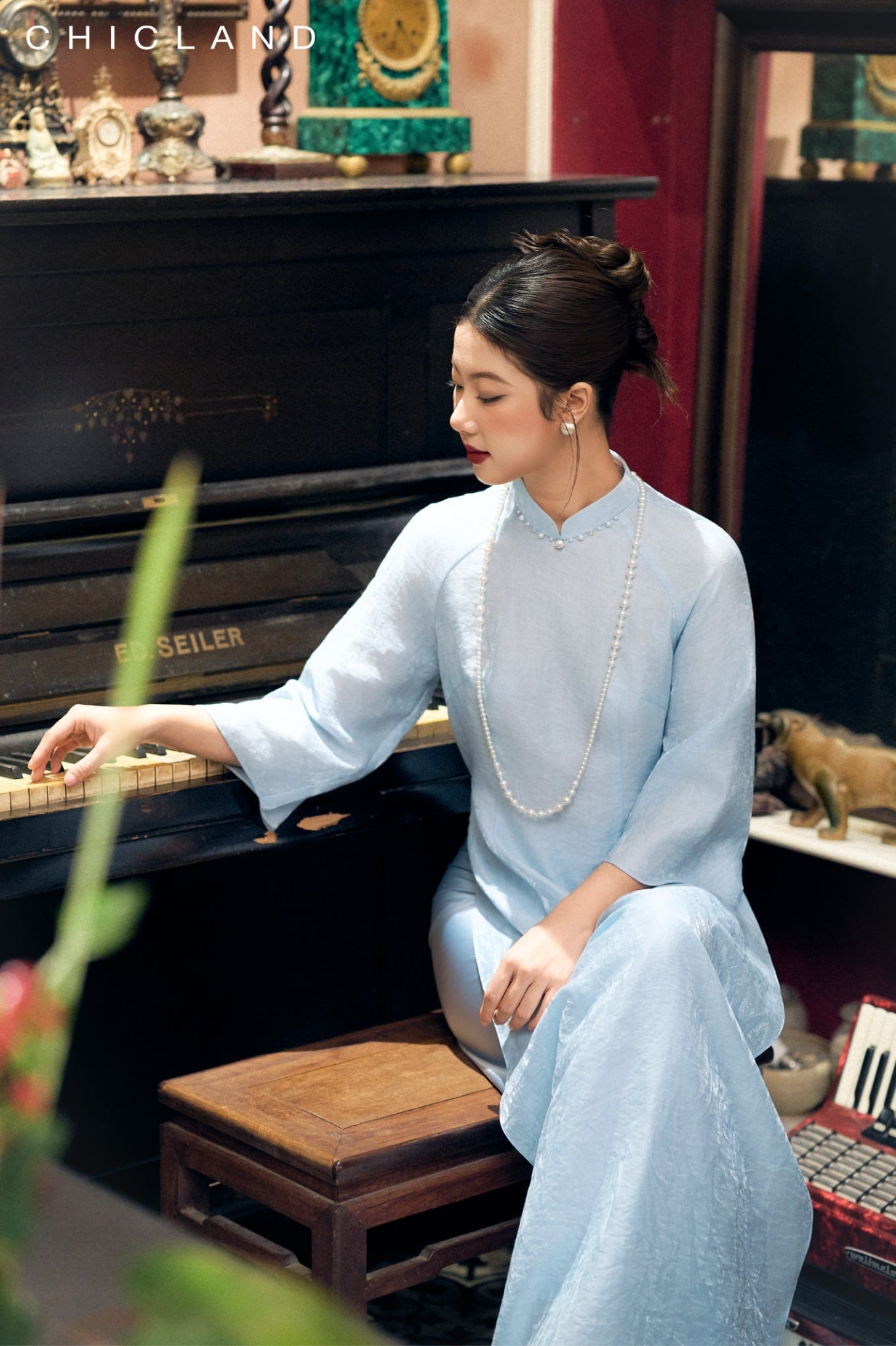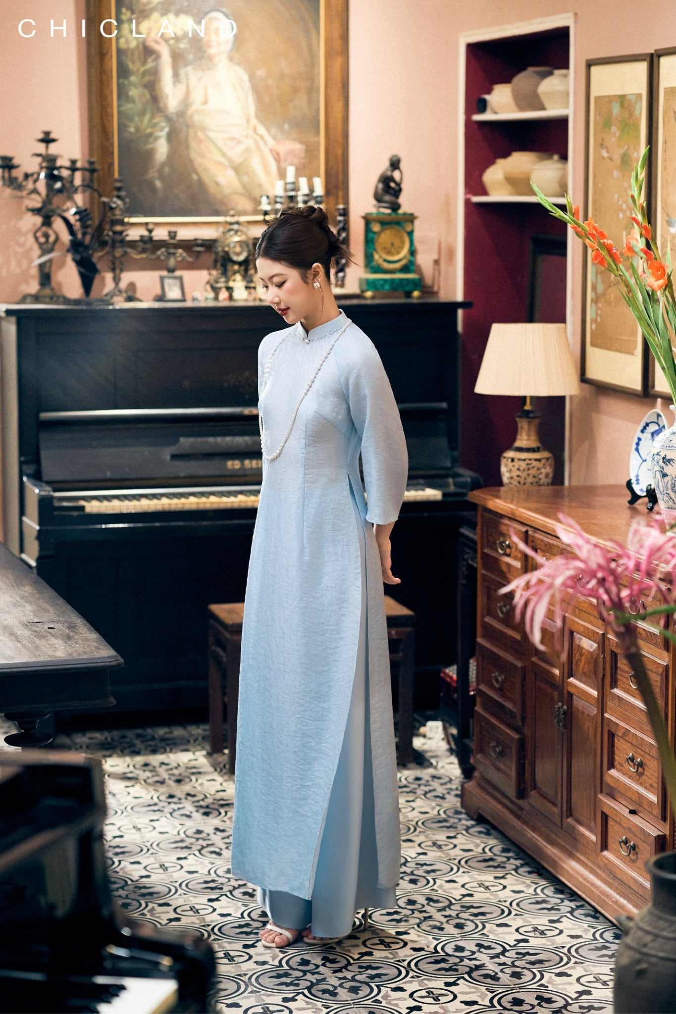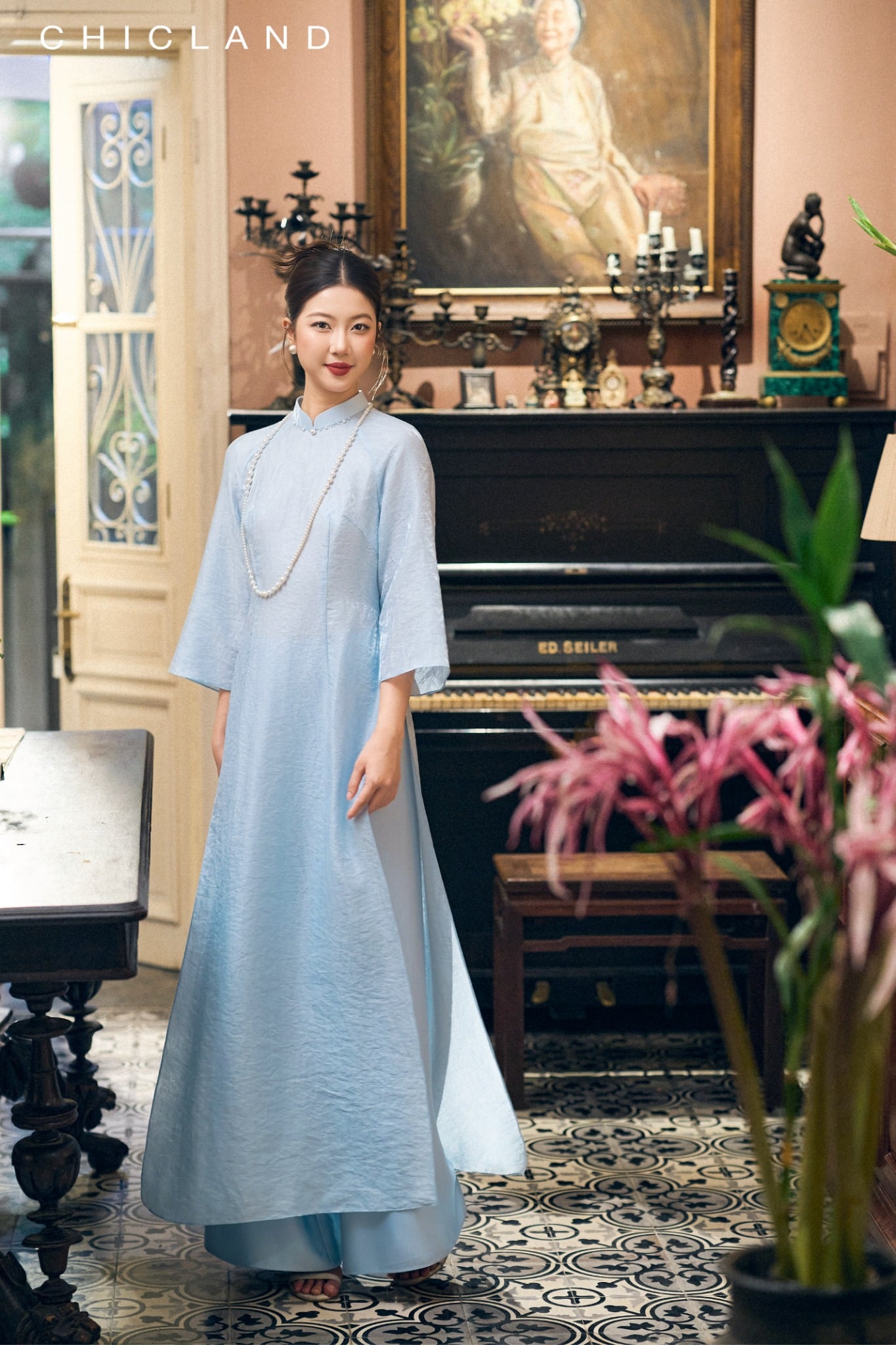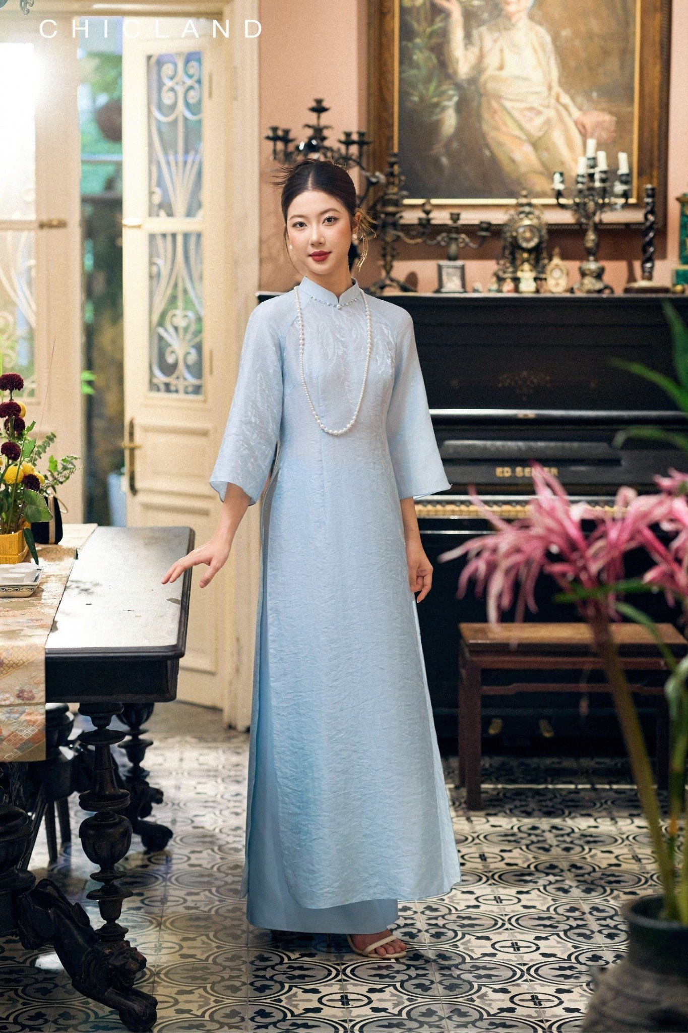 Chất liệu Lụa Chic-Land: Dòng sản phẩm: Áo Dài Chất liệu: Sử Dụng Sợi Tơ tự Nhiên, Bề Mặt vải Mịn Màng, Bóng Tự Nhiên, Nhẹ Nhàng, Thoáng Mát. Màu Sắc Áo : Xanh Màu sắc Quần : Xanh