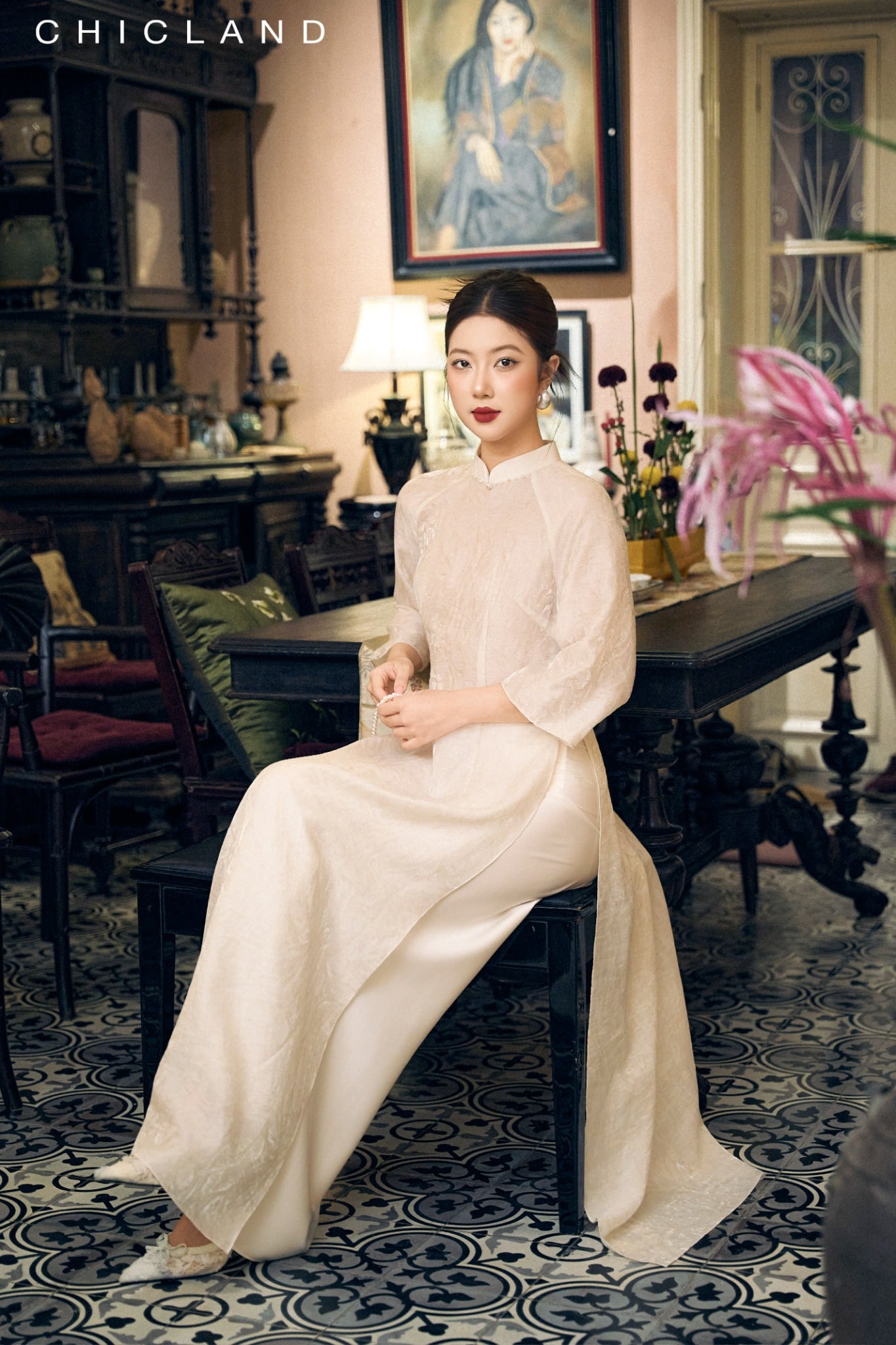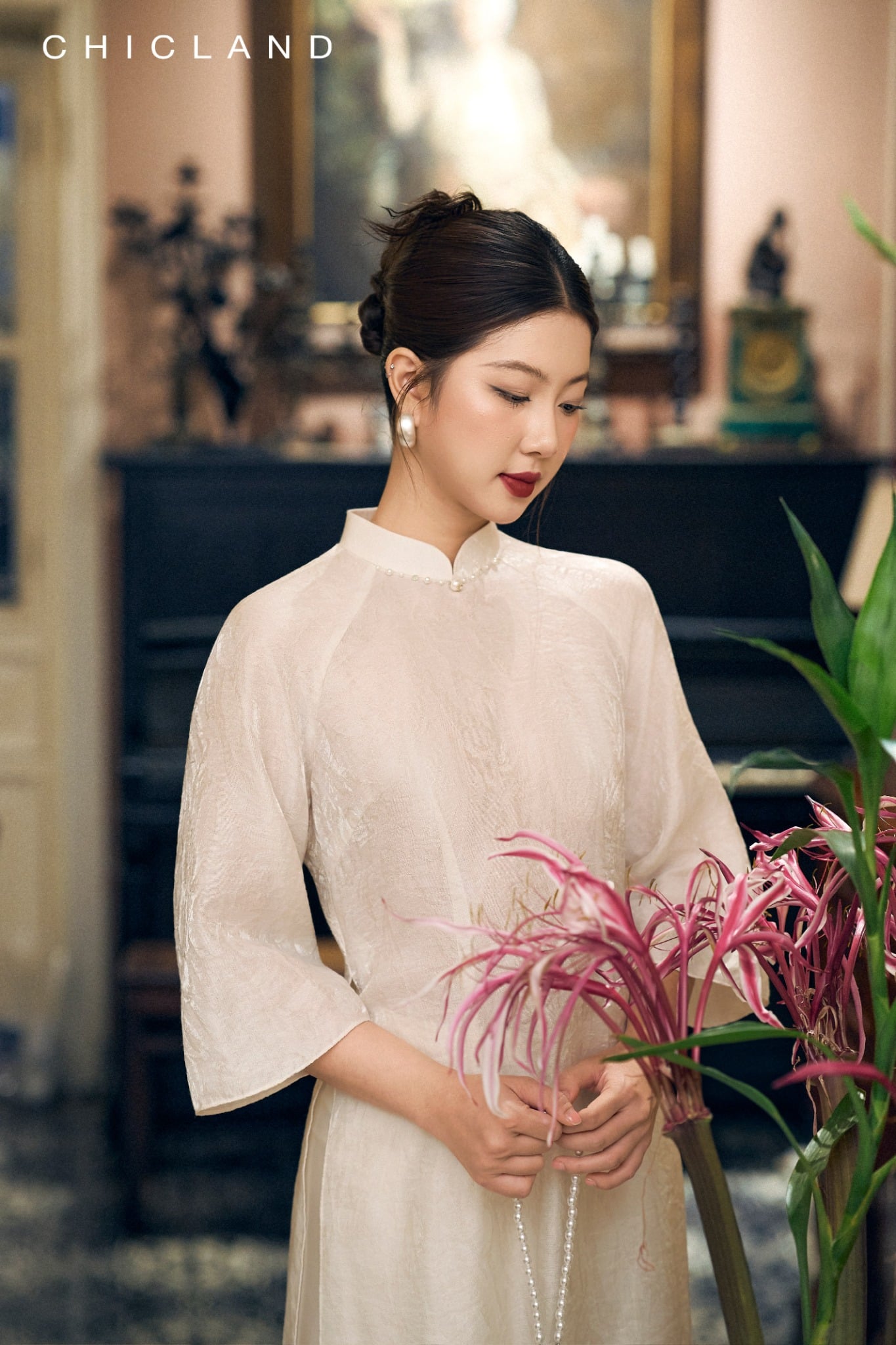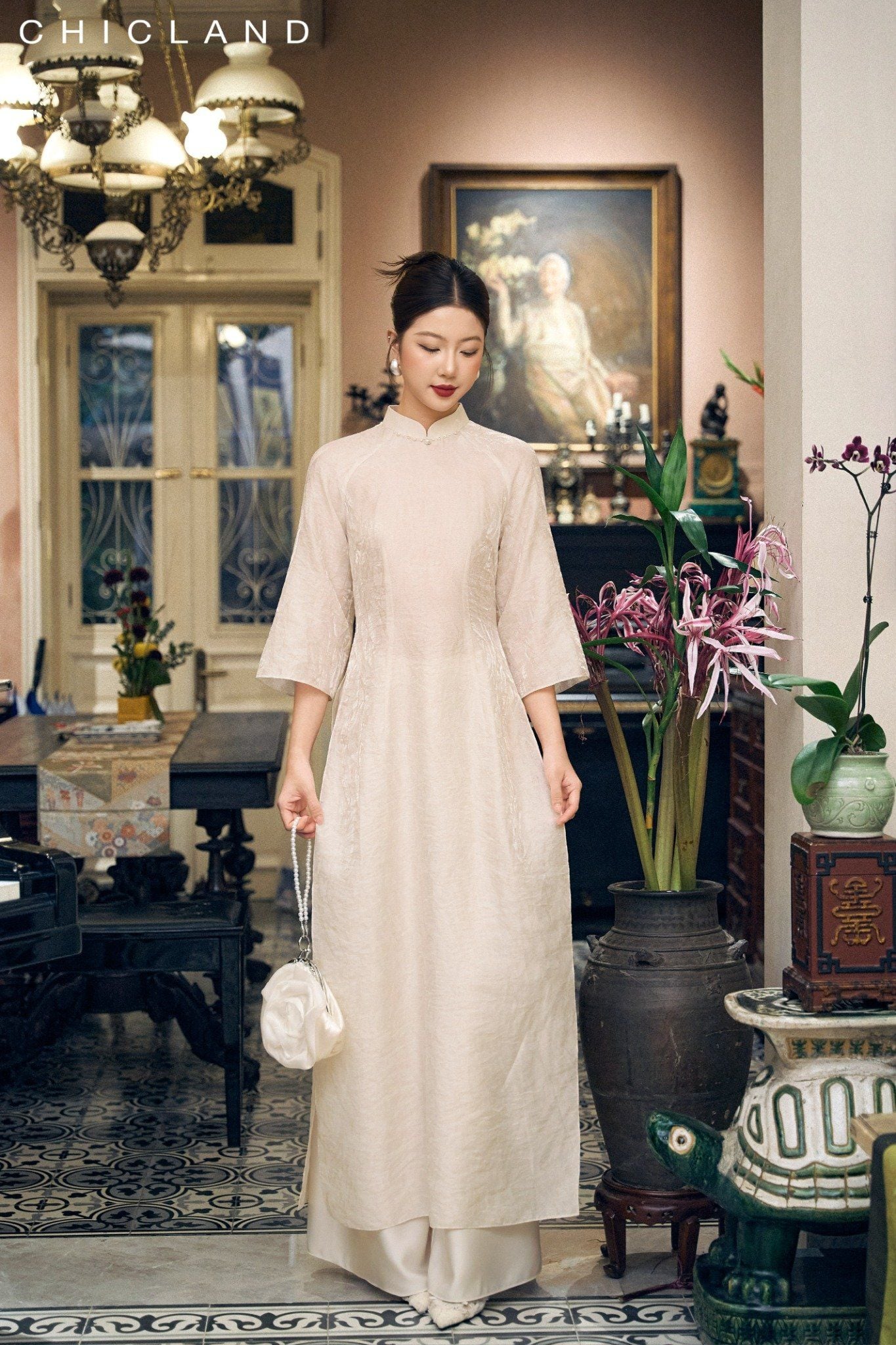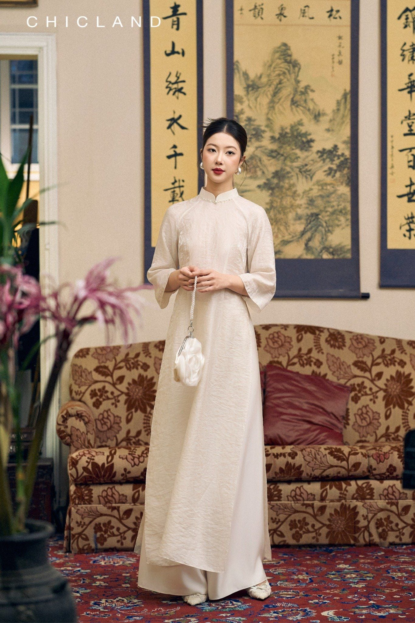 Chất liệu Lụa Chic-Land: Dòng sản phẩm: Áo Dài Chất liệu: Sử Dụng Sợi Tơ tự Nhiên, Bề Mặt vải Mịn Màng, Bóng Tự Nhiên, Nhẹ Nhàng, Thoáng Mát. Màu Sắc Áo : Trắng